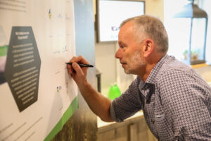 “Wat me opvalt is dat we enorm gewend zijn om te polderen. Ik denk dat het een grote belemmering is om grote uitdagingen waar we voor staan op te lossen. Polderen vertraagt de noodzakelijke transities. Ga dus niet op zoek naar draagvlak, maar handel vanuit de noodzakelijke stip op de horizon. Het is tijd om door te pakken en ook impopulaire maatregelen te nemen die nodig zijn om tot een duurzame samenleving te komen die in balans is met de aarde.”